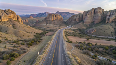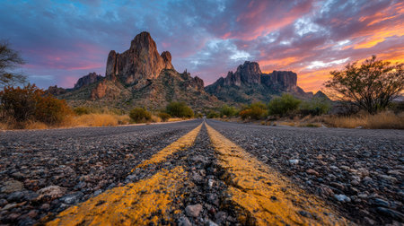 A paved road stretches towards a large mountain range under a vibrant, colorful sky at sunset. The image features a low-angle perspective emphasizing the road's texture and leading lines. The scene presents natural light, creating a vivid and eye-catching landscape suitable for various commercial and editorial applications.