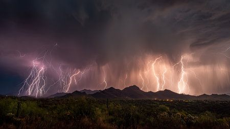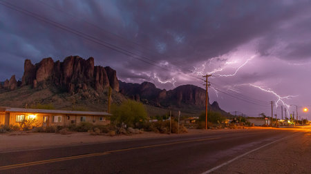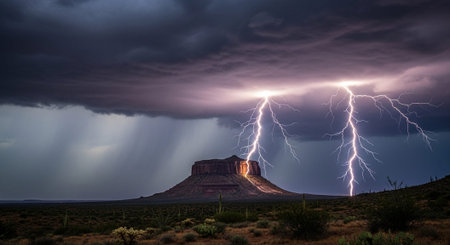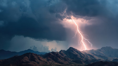 Lightning strike in the sky over a mountain range in Arizona, USA