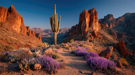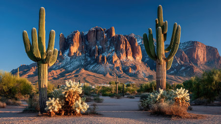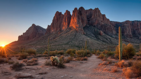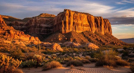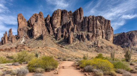 Majestic red sandstone cliffs rise dramatically in the arid desert surrounded by saguaro cacti yellow bushes and a winding dirt path under a partly cloudy blue sky
