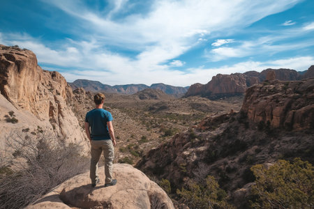 Photo of a vast desert landscape with rocky hills. In the distance, an empty valley where a small figure sits on a rock, gazing out over it all. The scene has a cinematic quality, captured with an Arri Alexa camera. --ar 3:2 --v 6.1 Job ID: 7847382d-b8a5-4d7d-ac78-c5c1780a0196