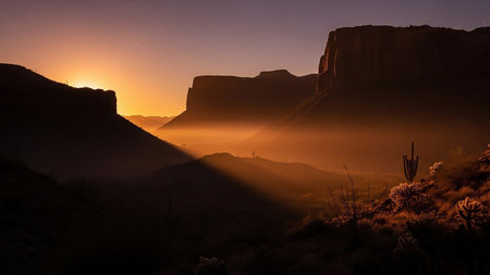 Sunbeams pierce through mist in a desert canyon at sunrise, illuminating the rugged landscape and silhouetted cacti.