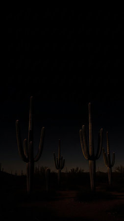 Silhouettes of several saguaro cacti stand starkly against a dark desert sky, creating a dramatic and moody atmosphere.