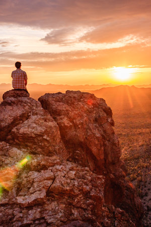 Sharm El Sheikh, Egypt - January 24, 2018: Man is feeling freedom in the top of the mountian