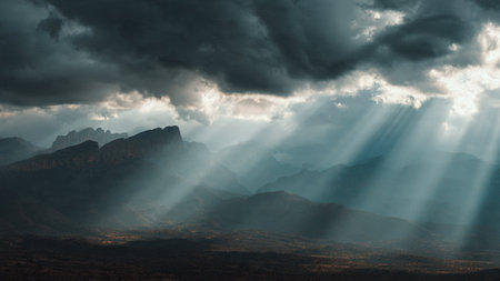 Cinematic sunset over rocky desert landscape with dramatic clouds and fading light
