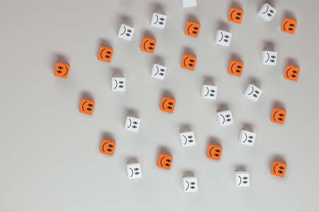cubes with happy emoticons as a group and unhappy ones in the back on concrete background - 3d illustration