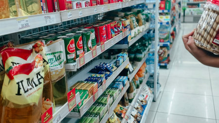 A well-stocked supermarket aisle with shelves filled with various packaged products, showcasing retail and consumerism in a busy environment.
