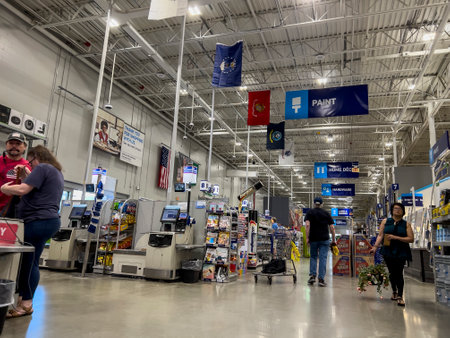 Mill Creek, WA USA - circa June 2022: Angled view of people shopping inside a Lowe's home improvement store.