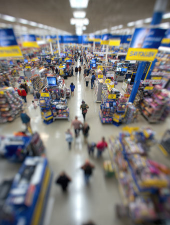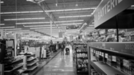 defocused abstract blur background of supermarket, minimarket, major retailer or convenience store in America for content creation
