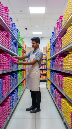 A vertical composition focusing on a retail employee's full body as they stack bags of Holi color po