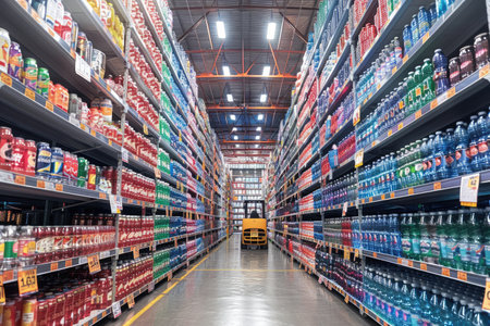 Supermarket with a variety of products, a long corridor, and light bulbs on the ceiling. Generative AI