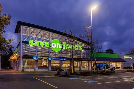 SURREY, CANADA - SEPTEMBER 25, 2019: save on foods store strip mall in early morning