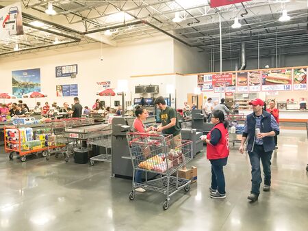 Crowded people waiting in line for checkout at Costco warehouse with social distancing near Dallas, Texas