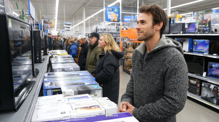 Shoppers filling a store during Black Friday, with large sale signs hanging above and crowded checkout lines forming.