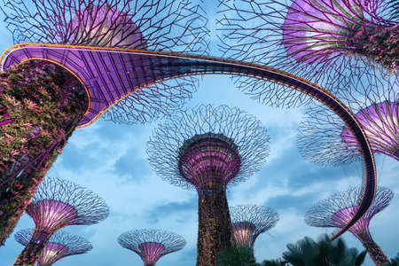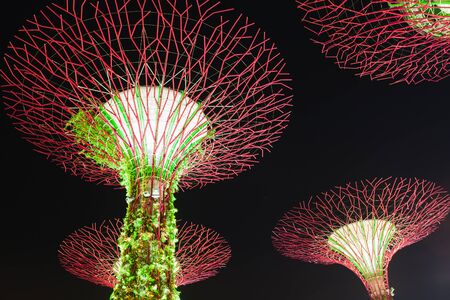 Singapore - April 29, 2018: Supertree Grove at Gardens by the Bay during Light Show with purple, indigo and red lighting in central Singapore, Marina Bay area. Night scene. Bottom view.