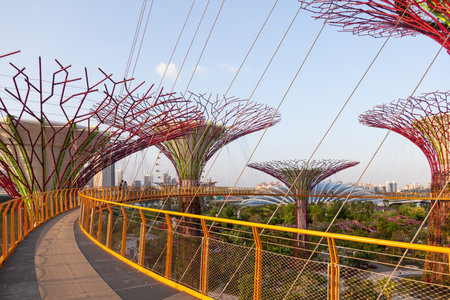 Singapore- Sep 9, 2021: OCBC Skyway aerial walkway between Supertree Grove artificial tree constructions in Gardens by the Bay