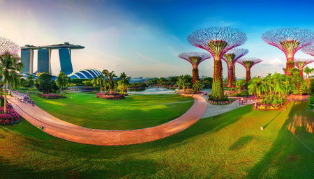 Singapore, Singapore - January 17, 2018: Twilight view of Gardens by the Bay at sunset, Supertrees on the horizon, Singapore.