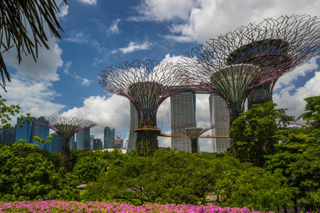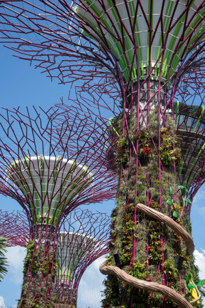 Singapore - February 18, 2017: Amazing bottom view of the Supertree Grove at Gardens by the Bay and the Marina Bay Sands Hotel. Vertical gardens of Singapore are a popular tourist attraction of Asia.