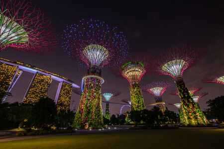 SINGAPORE -MAY12: Futuristic view of amazing illumination at Garden by the Bay on May 12, 2014 in Singapore. Night light show at Supertree Groveis is main Marina Bay Sands district tourist attraction