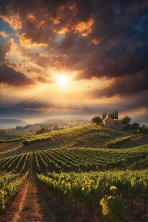 Breathtaking vineyard landscape at sunset showcasing lush grapevines in Tuscany, Italy