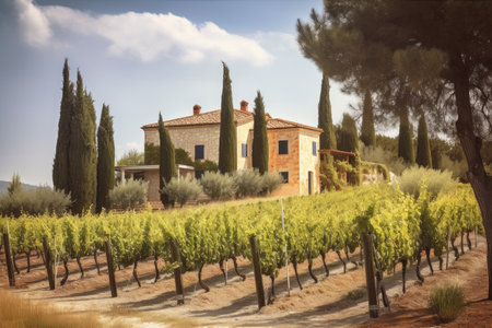 mediteranean house with vineyard, olive grove and cypress trees in the background, created with generative ai