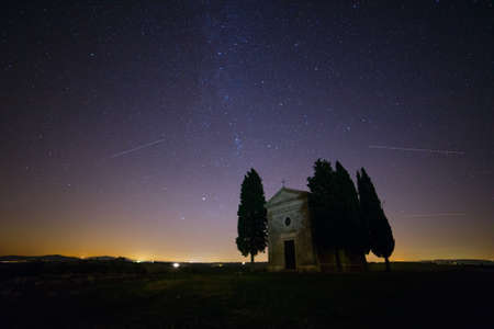 Italy. Tuscany. Lonely chapel and cypress trees in a field. Night sky with myriads of stars