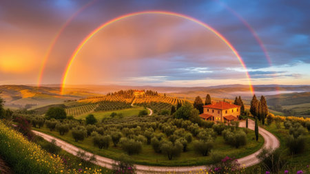 Rainbow over the Tuscan landscape, Tuscany, Italy