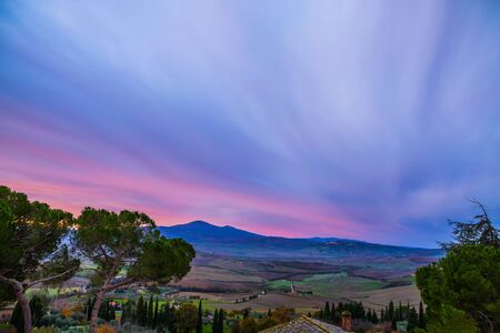 Amazing colorful sunset in Tuscany. Picturesque agritourism and typical rural landscape in Tuscany, Italy, Europe.