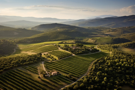 Scenic vineyard landscape aerial view of sunny wine grape hills and villa, ideal for farm banner