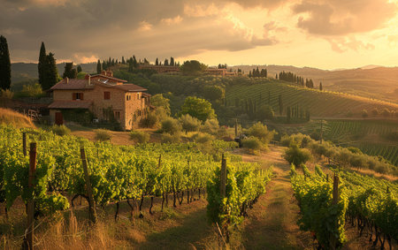 The sun sets over a lush Tuscan vineyard, casting a golden glow over the rolling hills and estate