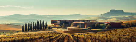 A stunning modern winery located in a beautiful valley. The building features sleek architecture surrounded by lush vineyards and distant hills, capturing the essence of rural tranquility.