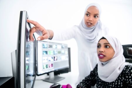 friends at office two young afro american modern muslim business women wearing scarf on creative bright office workplace with big screen