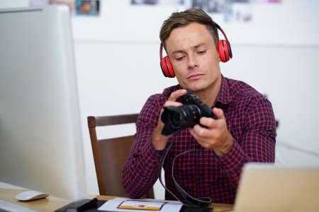 Handsome young man in headphones looking at photos in his camera