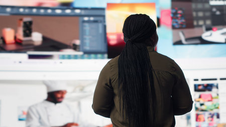 Viewer looking at video wall, watching content, enjoying digital age lifestyle. African american woman enjoying social media technology bridging people worldwide, camera B