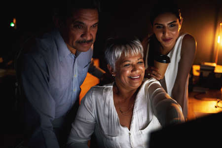 Their motto is, Work comes first. Shot of a group of young colleagues using a computer together during a late night at work.