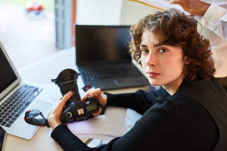 Self-employed photographer with camera and laptop Computer in the photo studio