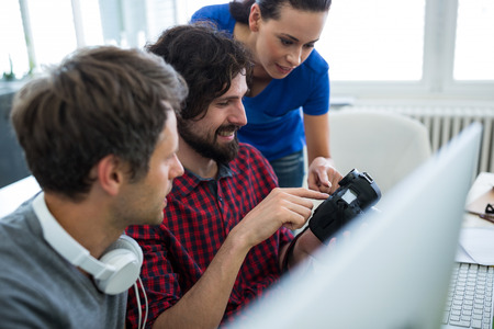 Close-up view of young male photographer checking his images on camera in his workplace