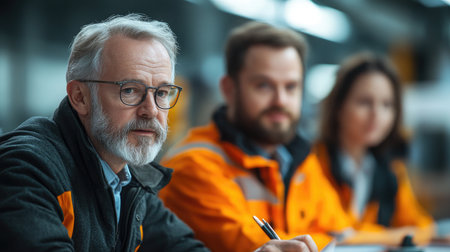 Portrait of heavy industrial workers working at night.