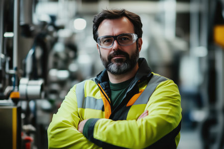 Portrait of engineer in safety gear standing confidently with arms crossed in factory setting surrounded by machinery and industrial equipment without looking at camera