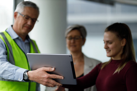 A team of competent engineers wearing safety equipment is working on blueprints with a tablet while also discussing with the investor in the office.
