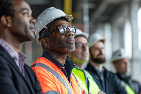 A Diverse professionals at construction site, showcasing teamwork and industrial development