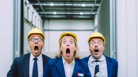 Funny male and female electricians in protective goggles and gloves looking sideways in shock and terror as their colleague got struck by electricity standing at wall wit : Generative AI