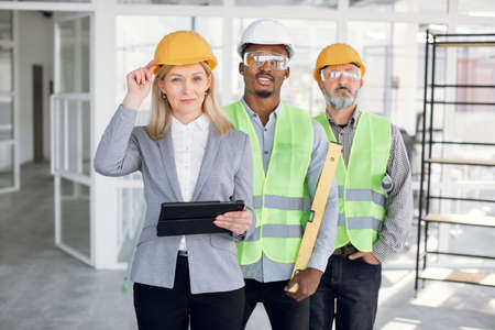 Front view of one beautiful woman and two bearded men in protective helmets looking at camera while standing on object with blueprint and tablet. People of different age, gender and race.