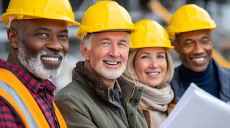 Diverse group of construction workers and engineers smiling while standing on a building site