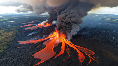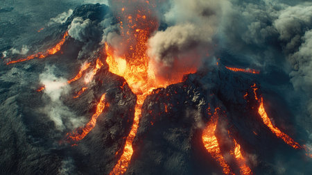 High aerial view capturing the contrast between fiery lava flows and dark volcanic ash. AI generated.