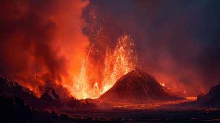 Fiery volcanic eruption spewing lava and thick ash into the sky