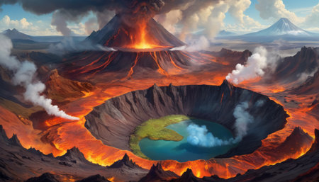 A dramatic volcanic landscape erupting, with a fiery lava lake at its core and smoke plumes rising against a backdrop of rugged peaks and ash clouds.. AI Generation