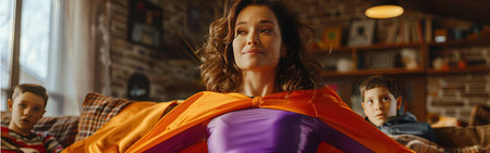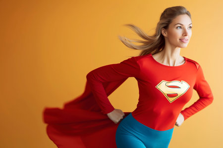 Unleashing her inner superhero, a woman embraces her role as a powerful and dynamic housewife against a plain color background. Fictitious person generated by Ai.