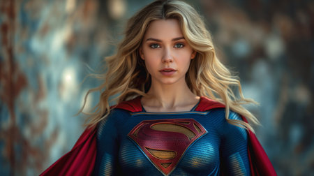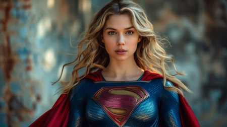 Portrait of a beautiful young woman wearing a superhero costume standing against a wall.