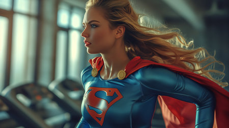 Beautiful young woman in superhero costume. Superhero girl in the gym.