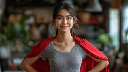 happy asian woman in red superhero cape